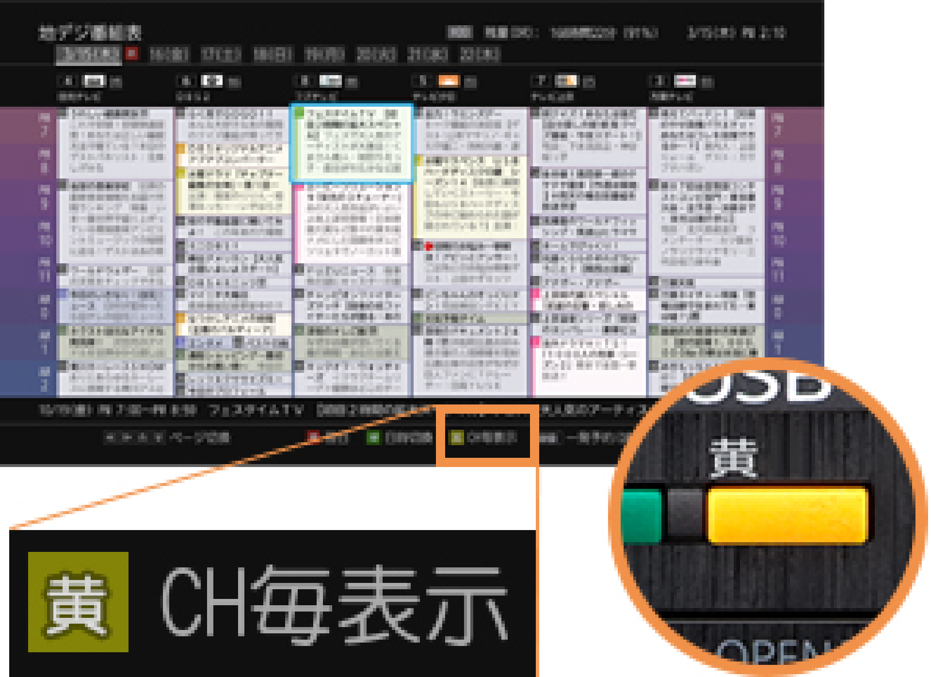 番組表はチャンネル別に表示することもできます。お気に入りのチャンネルだけを一週間分確認したいときに便利です。番組表表示時に、リモコンの黄色ボタンを押すことで切り替えることが可能です。