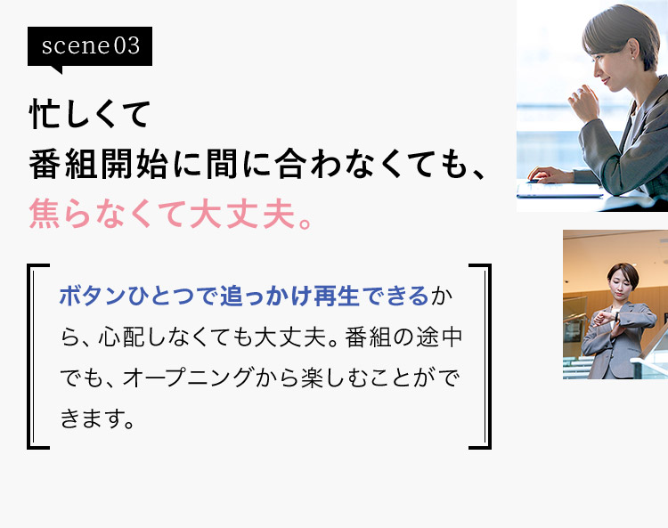 テレビをつけて面白そうな番組を見つけたら、「始めにジャンプ」ボタンで番組の冒頭から追っかけ再生。番組の途中でもオープニングから楽しむことができるから、帰宅時間を焦る必要はもうありません。ボタン1つで30秒前に戻る「ちょっとバック」にも対応しているので、番組視聴中の衝撃のシーンも、繰り返しお楽しみいただけます。 ※本機能は、「タイムシフトマシン」機能で録画中の番組に対してのみ動作します。