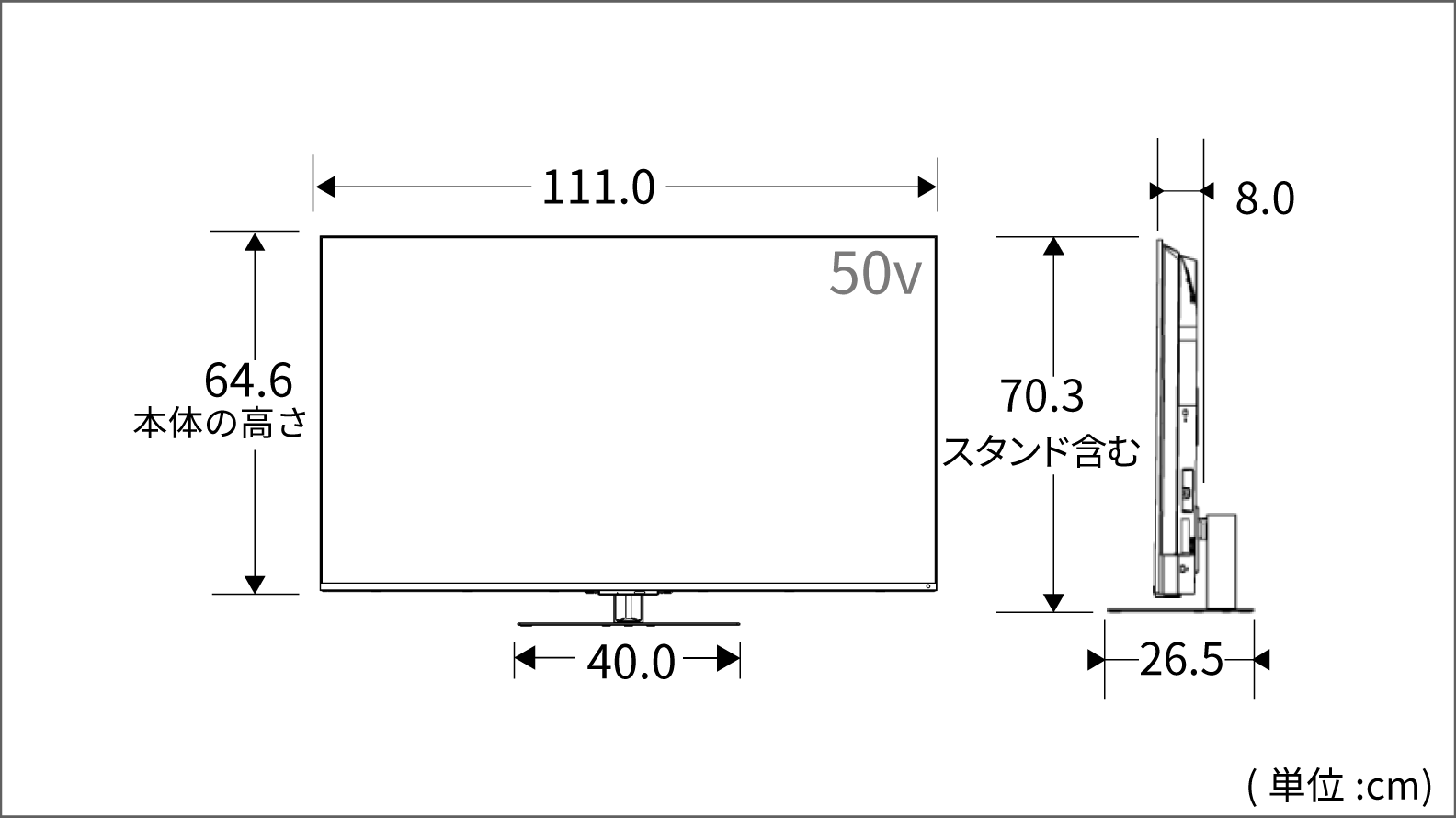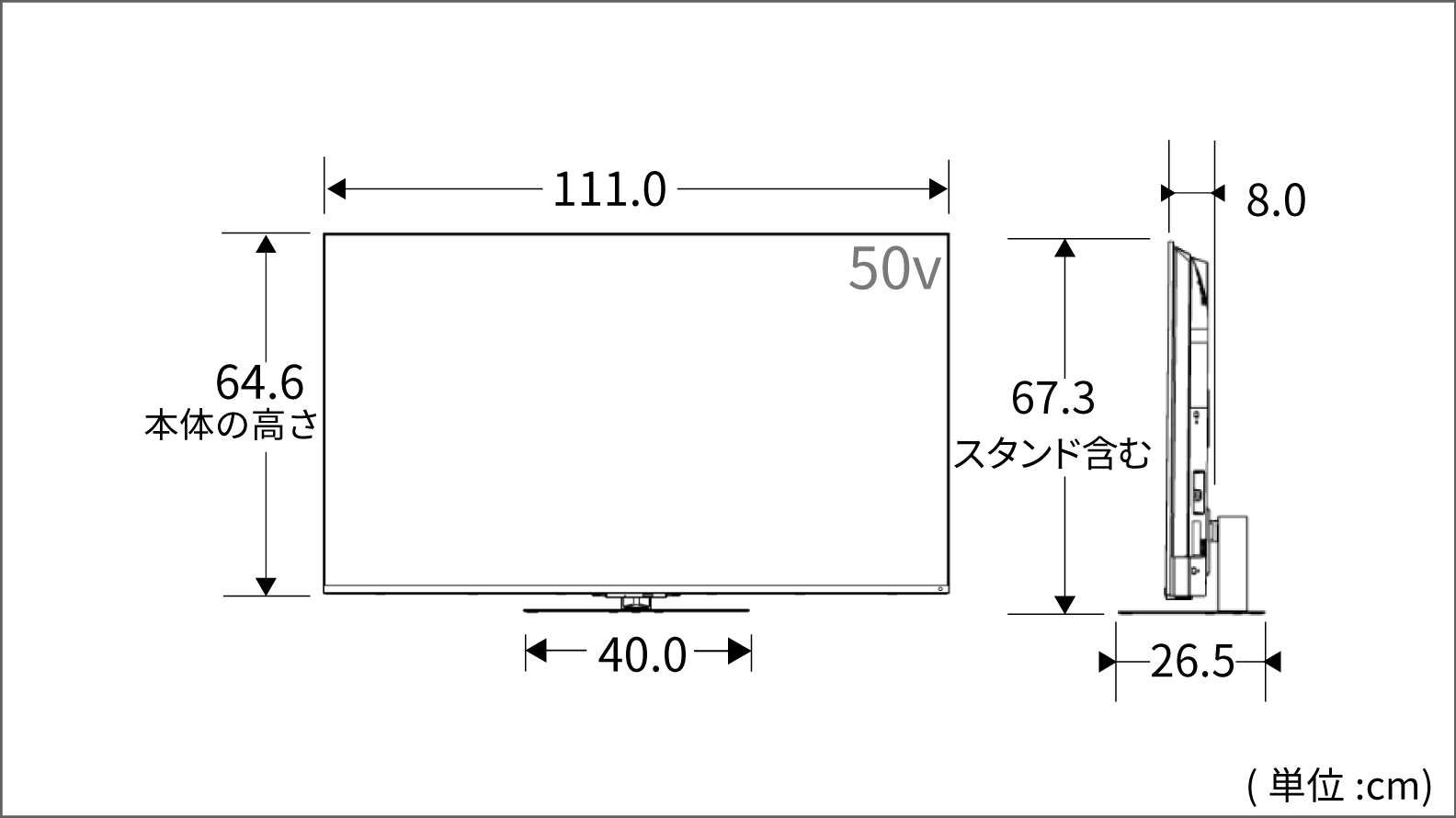 | 外形寸法(スタンド付き) | 幅 111.0cm,高さ (低)67.3cm/(高)70.3cm,奥行 26.5cm |
