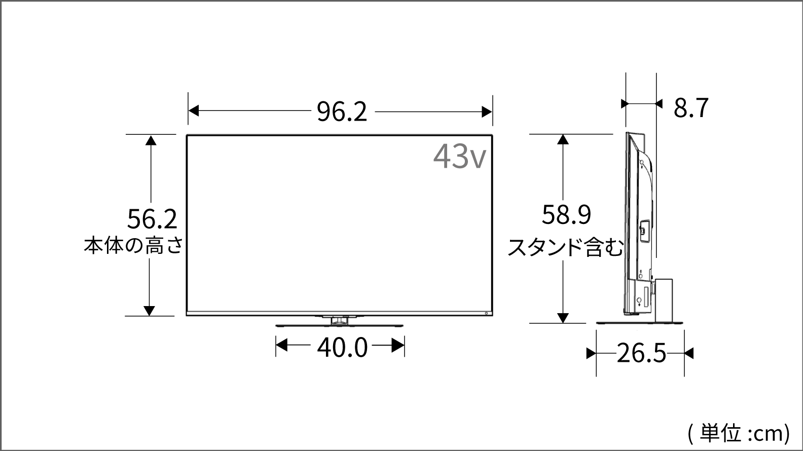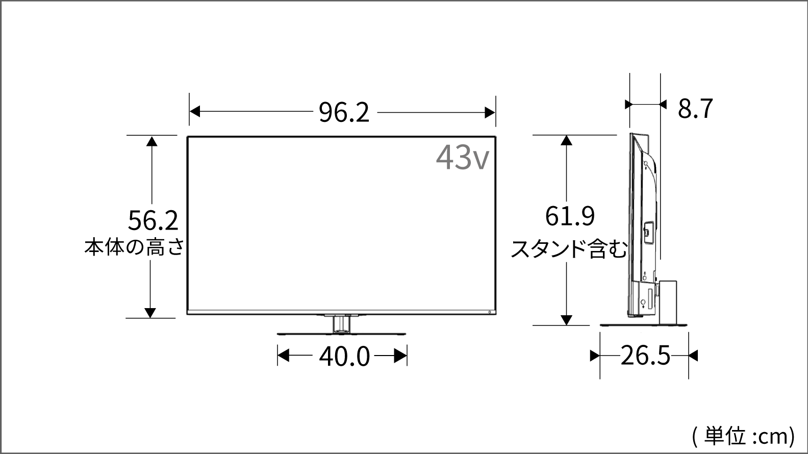 | 外形寸法(スタンド付き) | 幅 96.2cm,高さ (低)58.9cm/(高)61.9cm,奥行 26.5cm |