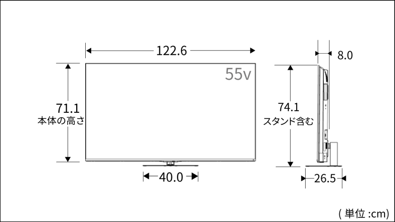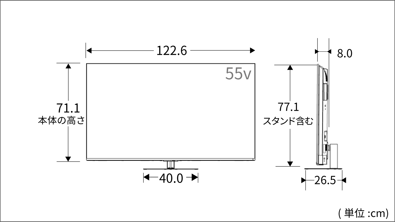 | 外形寸法(スタンド付き) | 幅 122.6cm,高さ (低)74.1cm/(高)77.1cm,奥行 26.5cm |