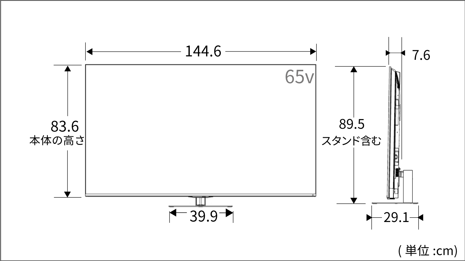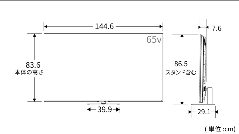 | 外形寸法(スタンド付き) | 幅 144.6cm,高さ (低)86.5cm/(高)89.5cm,奥行 29.1cm |