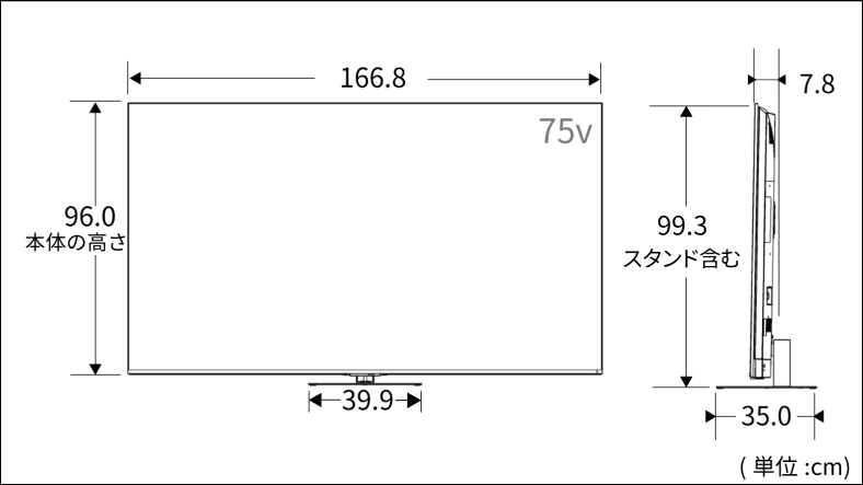 | 外形寸法(スタンド付き) | 幅 166.8cm,高さ (低)99.3cm/(高)102.3cm,奥行 35.0cm |