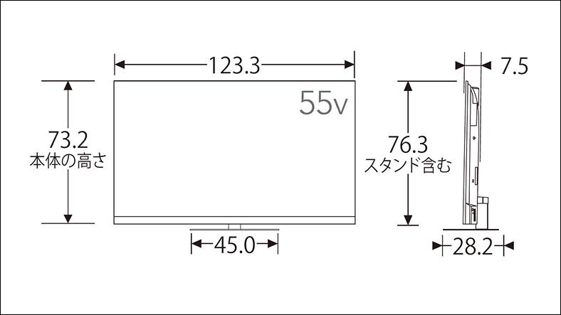 | 外形寸法(スタンド付き) 幅×高さ×奥行 | 123.3cm×76.3cm×28.2cm |